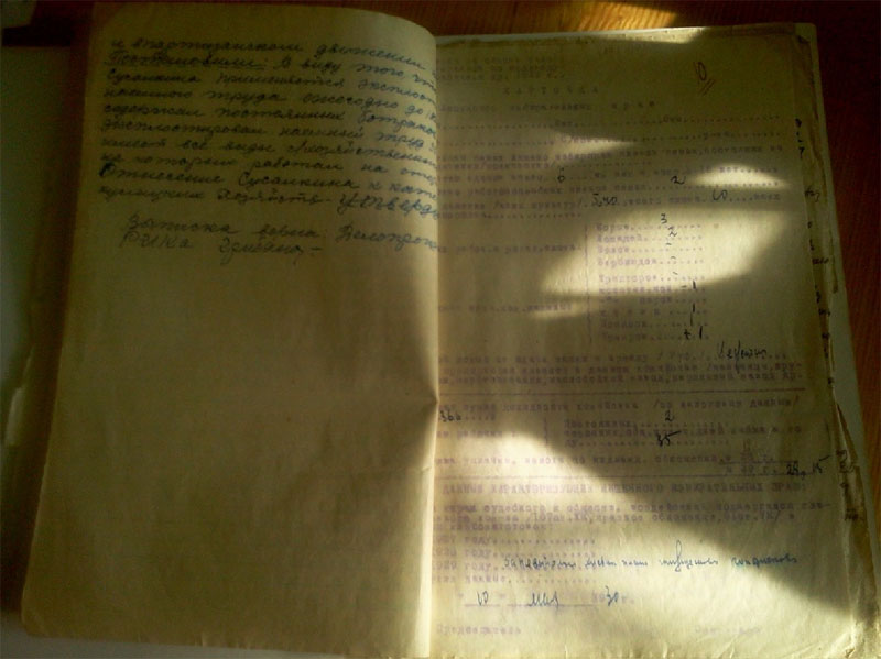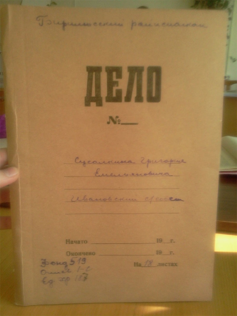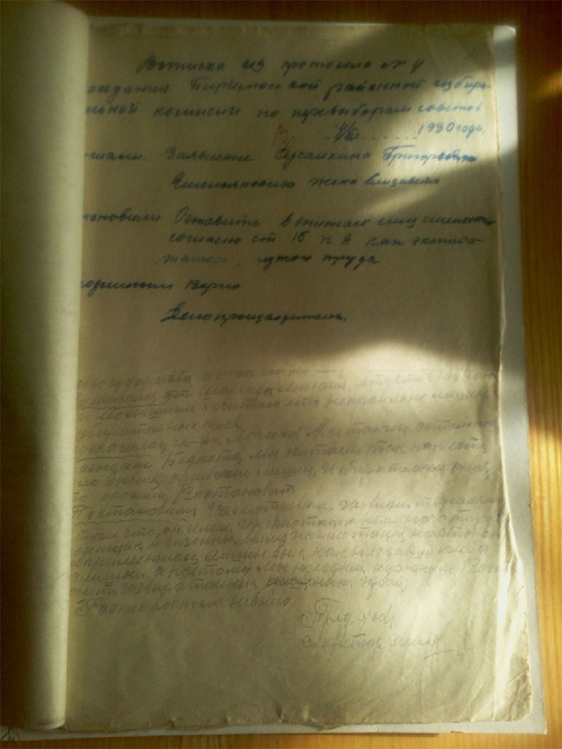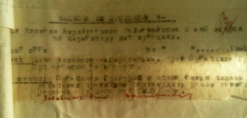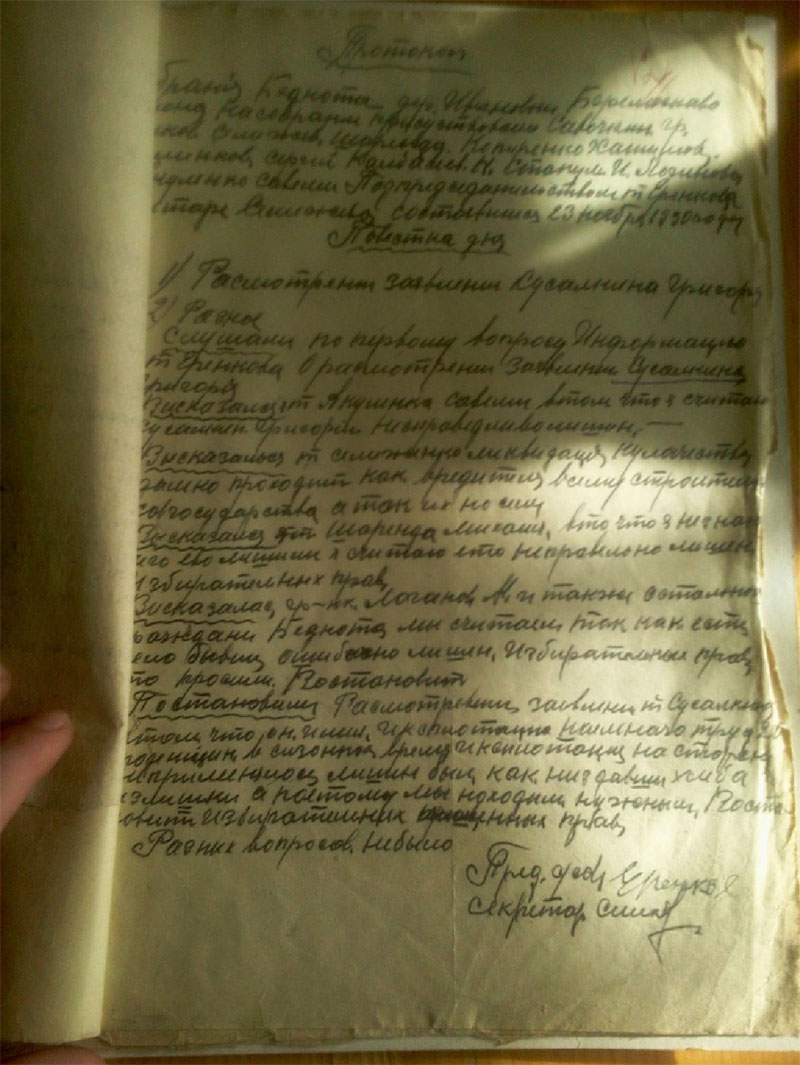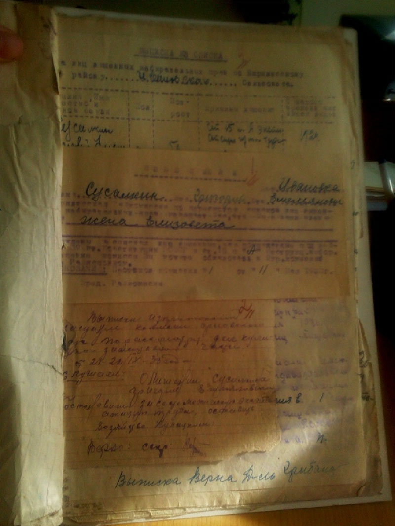 Рассматривая личное дело прадеда, я читаю карточку лишенного избирательных прав, датируемую 10.05 1930годом. В семье шесть едоков (а к этому времени их стало семеро, родился младший сын Степан) работоспособных – двое, 3 коровы, 2 лошади, 5 овец, 2 свиньи, 6 ульев рамочных, колодок – 3 штуки. Посев 5,40 десятин. В хозяйстве имелись сеялка, жатка, грабли, «которые позволяли Сусалкину эксплоотировать население», записано в выписке из протокола внеочередного заседания президиума Бирилюсского райисполкома 05.05.1930года, а в карточке записано, что годовой доход от сдачи машин в аренду не установлен. В справке, выданной прадеду, что хозяйство признано кулацким пишут «в 27г. держал батрака, в 28-29г. имел поденщиц 12 дней. Ряд людей работали за мед, установить не представляется возможным». Если не представляется установить, возникает вопрос: «На основании чего происходило раскулачивание?» Взаимопомощь всегда была в чести у русского народа, а особенно среди родственников, и поэтому часто во время уборочной или посевной собирались все вместе и помогали друг другу. А еще за помощь всегда и благодарили. Чем же мог отблагодарить прадед? Конечно же, медом, раз у него была пасека и помочь машинами: жаткой или молотилкой. А еще очень часто в более зажиточную семью брали кого-нибудь из бедных родственников, чтобы помочь, прокормить. Соответственно этот человек помогал в хозяйстве – таким образом, получалась «эксплоотация». Листая дело прадеда, мы насчитали 10 выписок из разных протоколов: избиркома Ивановского с/с, протокол заседания группы бедноты, протокол собрания бедноты д. Ивановка, протокол комиссии Бирилюсского Райисполкома, которые не один раз собирались. Видно не все было гладко в этом деле. Читаем протокол собрания бедноты от 23 ноября 1930 года «Слушали Акуленко Савелия - Сусалкин несправедливо лишен избирательных прав, Шарендо Михаил – неправильно лишен, Логинова – ошибочно лишен, просим восстановить в правах». Протокол заседания избиркома Ивановского с/с от 28.11 1930года «постановили как неподлежащим к лишению права голоса, т.к. ошибочно был лишен не за сдачу хлебных излишек, 1927 год имел 25 поденщиц, 1928 год – 15человек, 29 – 4 человека работали по установленным ценам и первую очередь бедноте, а потому гражданина Сусалкина восстановить в праве избирательного голоса и передать Райизбиркому на рассмотрение и утверждение». Постановление Райизбиркома было непреклонно: отнести хозяйство Сусалкина к категории кулацких хозяйств. Вспоминает жительница д. Ивановка Марченко А.С. « Григорку (прадеда) с детьми активисты выгнали из дома, а сами давай растаскивать добро. Кто одежду, кто материю тащил, даже серьги из ушей заставили снять Елизавету (прабабушка).