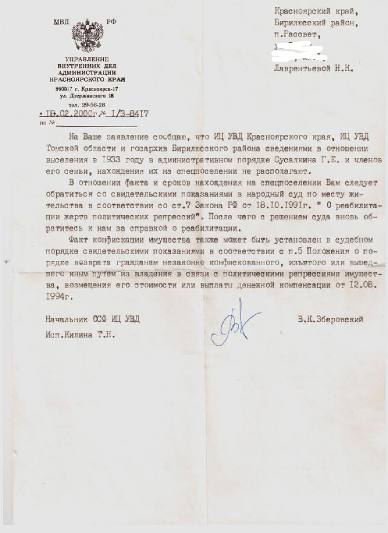 В ходе исследования «Репрессии в судьбе семьи моего прадеда» были изучены различные материалы, документы, фотографии, воспоминания репрессированных и их близких родственников. Изучая историю семьи своих предков, я не мог представить всех масштабов репрессий. Прошло много времени у многих из них по понятным причинам не сохранились фотографии, письма, все то, что окружало людей в привычной жизни. Только воспоминания и ярлыки «дочь или сын врага народа», которые преследовали их долгие годы. Когда государство заговорило о реабилитации и компенсации, до этого дня дожили немногие. В 1991 году был принят закон «О реабилитации жертв политических репрессий». По всей стране были созданы комиссии по восстановлению прав реабилитированных. Бабушка обратилась в УВД Томской области с просьбой о реабилитации, но пришел ответ «сведениями в отношении выселения в 1933 году Сусалкина Г.Е. и его семьи и нахождения на спецпоселении не располагаем…»