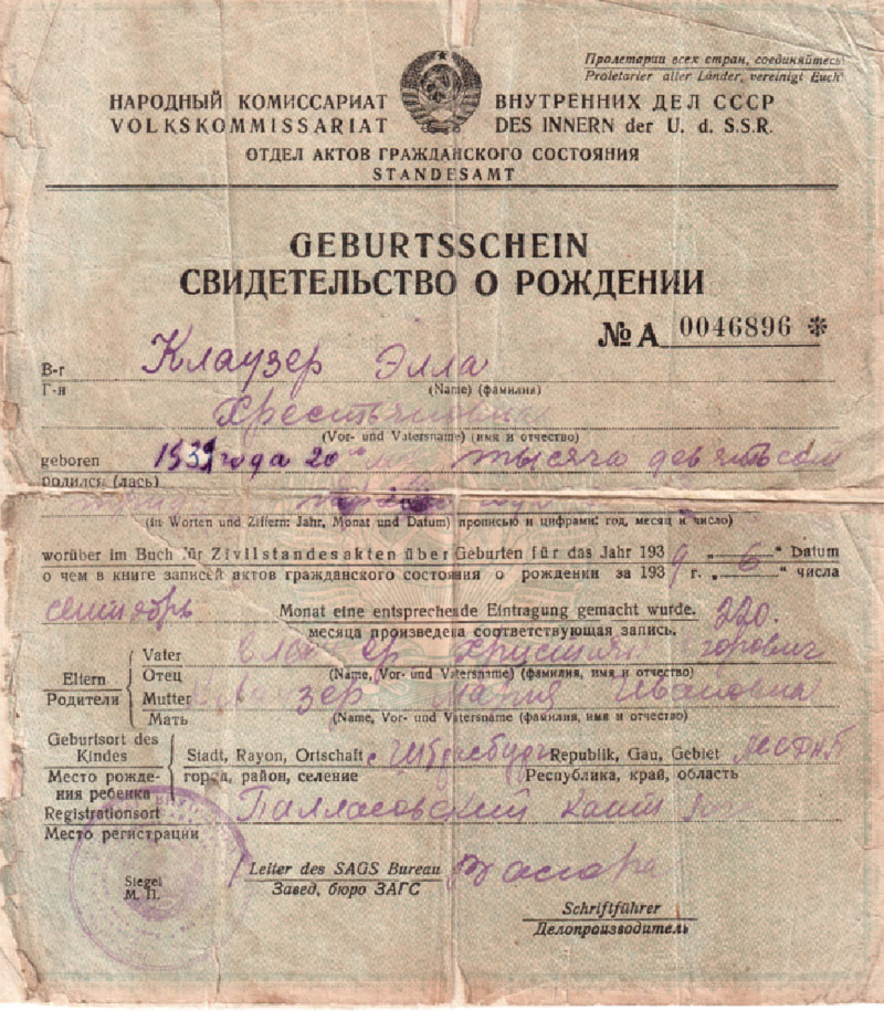 Свидетельство о рождении моей бабушки Кляузер Эллы Хрестьяновны