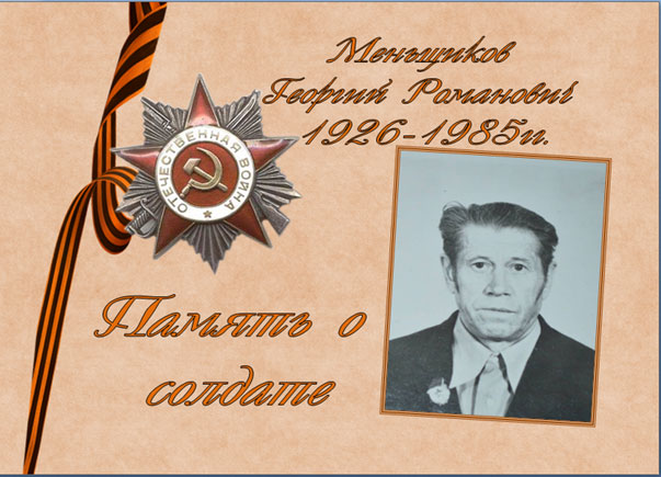 В мае 2016 года в нашей школе состоялась встреча с методистом Управления образования администрации г. Канска Янулиной Екатериной Георгиевной, которая посетила учреждение в преддверии выпускных экзаменов. Традиционно всем гостям мы предлагаем экскурсию в школьные музеи. В ходе экскурсии выяснилось, что отец Екатерины Георгиевны Меньщиков Георгий Романович - фронтовик, имеет высокие правительственные награды - Ордена Славы II и III степени. Мы сразу же загорелись идеей написать про этого удивительного человека исследовательскую работу, которая пополнит школьную летопись «Войны священные страницы навеки в памяти народной» об участниках Великой Отечественной войны Красноярского края. Желание еще больше укрепилось, когда Екатерина Георгиевна предоставила нам имеющиеся материалы об отце: документы, награды, личный дневник ветерана.