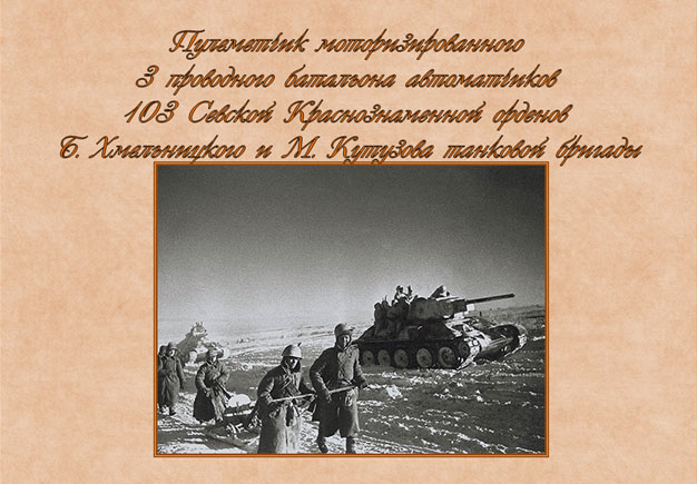 Военный путь его пролегал через запад СССР - Украину, Белоруссию, Литву, а затем через Польшу. Георгий Романович служил в должности пулеметчика моторизированного 3 проводного батальона автоматчиков 103 Севской Краснознаменной орденов Б. Хмельницкого и М. Кутузова танковой бригады, которая входила в конце войны в состав легендарного 1 Белорусского фронта. Из Интернета я узнал, что «…танковая бригада была сформирована на базе 119-го отдельного танкового батальона в марте 1942 в г. Вологда как 103-я танковая бригада. В неё вошли 119-й, 420-й танковые, 103-й мотострелково - пулемётный батальоны и ряд других частей. Была включена в 3-й танковый (с 20 ноября 1944 года 9-й гвардейский танковый) корпус. В составе этого корпуса, который входил в 61-ю армию Западного фронта, впервые вступила в бой в начале июля 1942 года севернее г. Волхов.