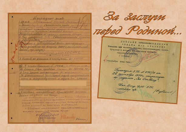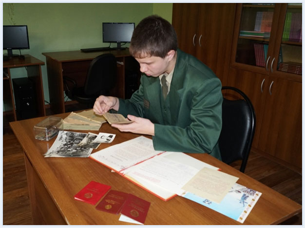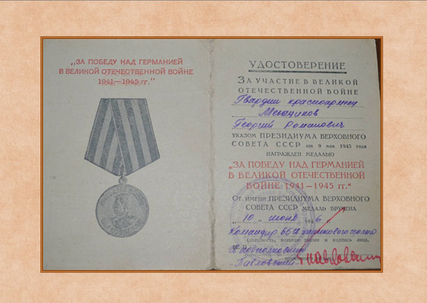 Захотелось больше узнать о Георгии Романовиче, что это был за человек, за что и при каких обстоятельствах он получил высокие награды Родины - Ордена Славы II и III степени. Возникла идея, проследить довоенную и послевоенную биографию Меньщикова Г. Р. Работа началась со сбора информации: семейного архива дочери фронтовика Янулиной Екатерины Георгиевны, поиска на сайтах «Герои войны» и «Подвиг народа». Работа захватила меня. Я впервые не только начал читать отрывки из воспоминаний участников войны, но и работал с «живыми» свидетельствами: фотографиями, воспоминаниями дочери Георгия Романовича, документами, наградами. От одного прикосновения к ним чувствуется непередаваемый колорит, «запах» того далекого прошлого. Мне кажется, что та «лента времени» или «связь времен», о которой нам много говорили на уроках истории, предстала более зримо через судьбу простого русского солдата - фронтовика.