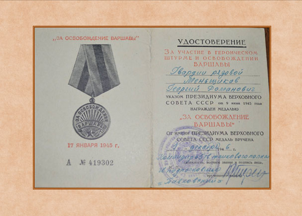 Враг был очень силен, огрызался. Понимал, что скоро конец войне и не в его пользу. Из наградного листа Меньщикова Георгия Романовича: «В наступательном бою 2 сентября 1944 года у села Ульясик в Польше из ручного пулемета уничтожил 7 немецких солдат. 4 сентября 1944 года подавил огневую точку противника, в боях увлекал за собой своих товарищей… Представить в ордену Красной Звезды». [5]