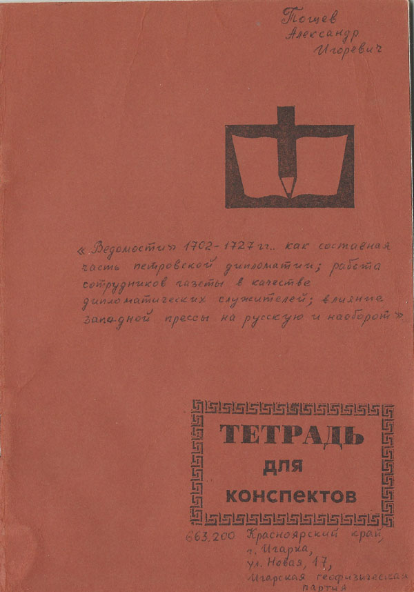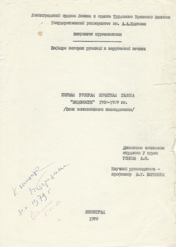 Дипломная работа могла служить основой для кандидатской работы. Александр Игорьевич был зачислен даже в г. Ленинграде в число соискателей Пушкинского Дома, именно при поддержке его сотрудников были подготовлены статьи, в которых рассматривались различные аспекты изданий первой русской печатной газеты. Например, в 2004 году вышли в печать сразу две статьи: «Внешнеполитические и социально-коммуникативные условия возникновения русской периодической печати»2 и «Процесс взаимодействия и взаимовлияния русской и зарубежной печати первой четверти XVIII века (на примере «Ведомостей и летучих листков»)3. Работая в тесном сотрудничестве с Пушкинским Домом (научный руководитель Г.Н. Моисеева), А.И. Тощев продолжал поддерживать тесные контакты с факультетом журналистики ЛГУ, участвовать по возможности в научных конференциях. Так, в 2002 г. он стал участником научно-практической конференции, посвященной 300-летию российской журналистики, в сборнике, который был выпущен к этой дате, есть и его статья «Первая русская печатная газета как составная часть петровской дипломатии»4. В 2009 году вышла книга «Петербург газетный», в которой была опубликована статья Александра Игорьевича «Окно в Россию. Графическое оформление первой русской печатной газеты «Ведомости» 1702-1727 гг.»5. У Александра Игорьевича сложились хорошие отношения с заведующей кафедрой истории журналистики профессором Березиной Валентиной Григорьевной. Даже после завершения учебы в университете он переписывался с Валентиной Григорьевной. «Спасибо за постоянную заботу обо мне», - писал он. Александр Игорьевич продолжал общаться с ней до самой ее смерти. При этом проявлял особую заботу об этом человеке, который стал в преклонном возрасте очень одиноким. Из далекой Игарки он отправлял ей продукты, купить которые в 90-е гг. было невозможно в Ленинграде. В одном из писем В.Г. Березина радуется тому, что любимый студент скоро приедет на конференцию, а также благодарит его за посылку. Позже он написал о ней статью не только как о выдающемся ученом, но и как о добром, умном и отзывчивом человеке. Она постоянно помогала студентам, общалась с ними, готовила их к научной деятельности. Долгое время А.И. Тощев поддерживал научные связи с преемником Березиной на кафедре журналистики – Г.В. Жирковым.