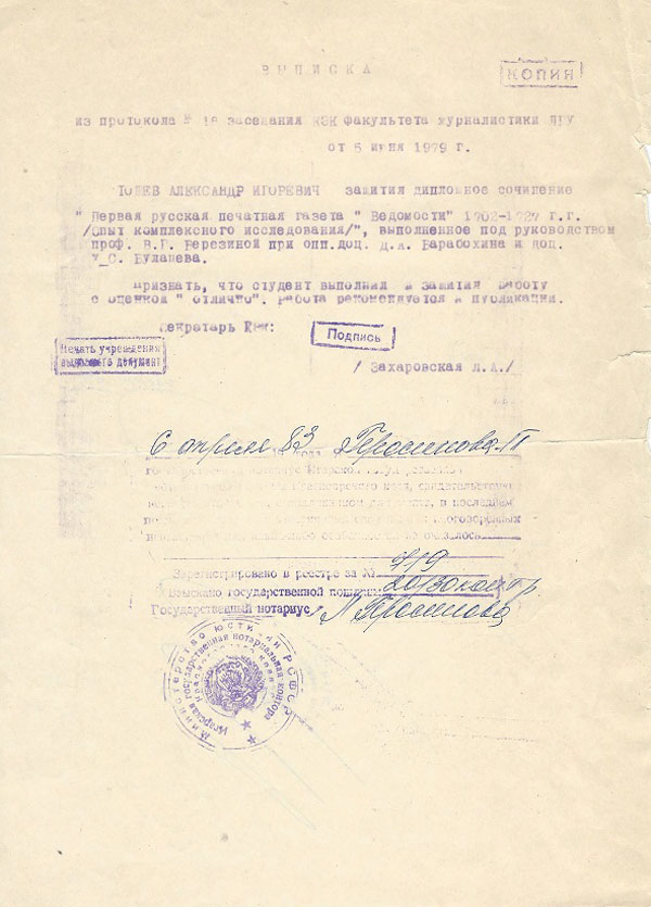Темой будущего диплома была история создания первой печатной газеты «Ведомости» Петром I. Преддипломная практика проходила в Польше, там он смог изучить многие документы, касающиеся подготовки информации за рубежом для первой газеты в оригиналах.