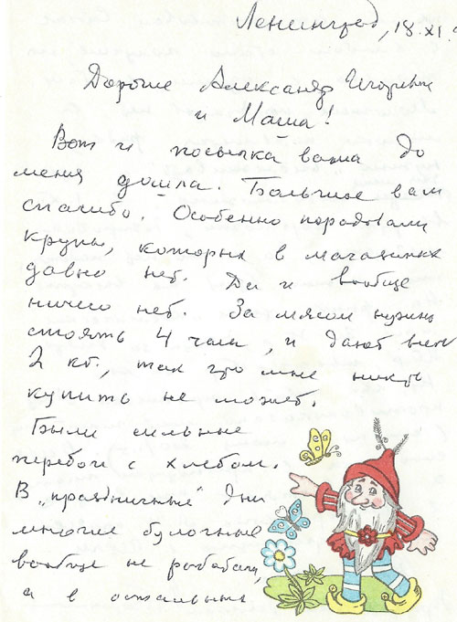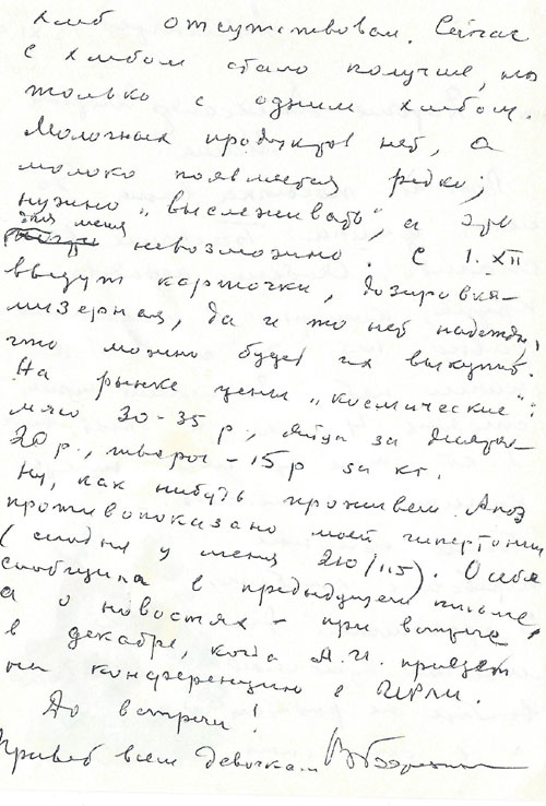 Вот всё. Я уже не могу долго и много писать, но всё, что я вам прочел, это от души. Теперь ещё такой вопрос. То, что я обещал, я сделал. Скажите пожалуйста, ведь Александр Игоревич собирался выпускать 4-й сборник. Он у меня брал на него материал. В частности, его интересовало СКБ заключенных в Игарке. Я ему послал полный состав инженеров-заключенных, полный план избы(?) их специального конструкторского бюро, ведь оно разрабатывало прокладку электрического кабеля по дну Енисея с одного берега на другой. Это я ему дал.