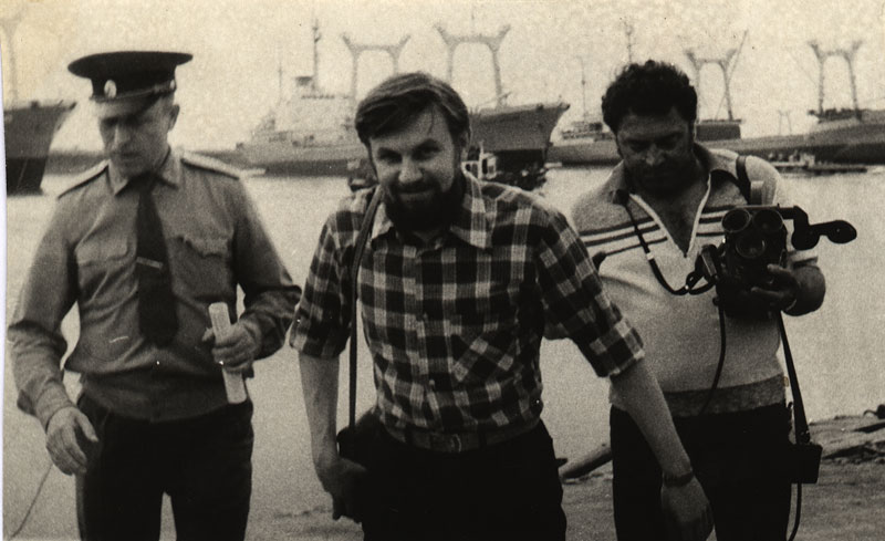 На съемках в морском порту с кинооператором П. Литвиненко. 1983 г.