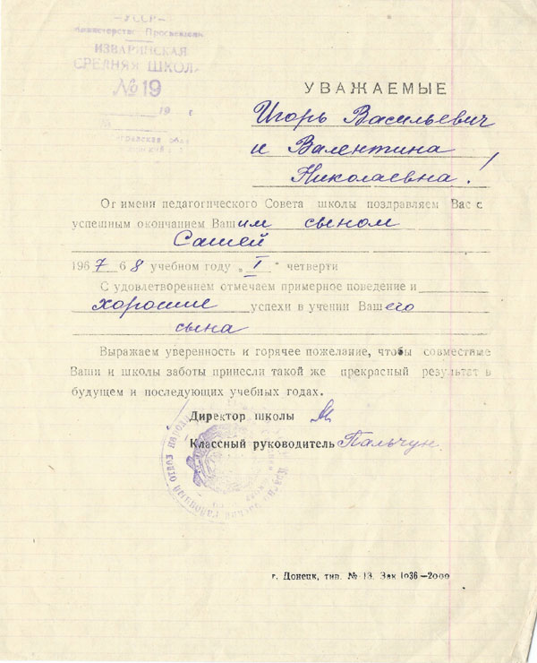 Благодарность школы родителям А. Тощева. 1968 г.