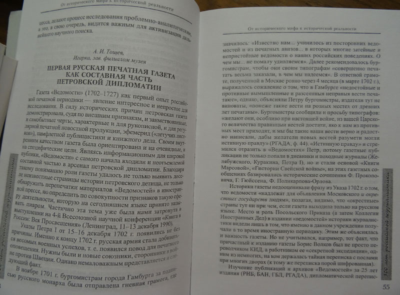 Статья А.И. Тощева «Первая печатная газета «Ведомости» как составная часть