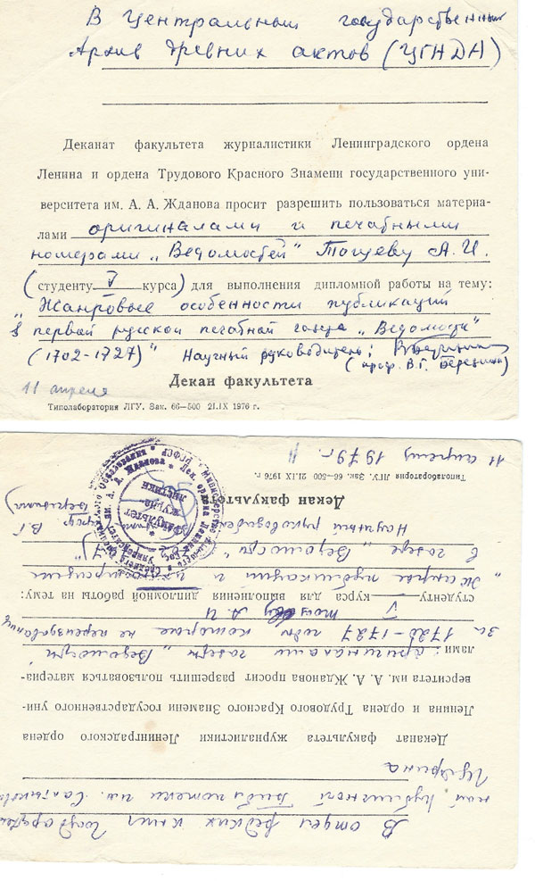 Ходатайство факультета журналистики, подготовленное В.Г. Березиной, в архив