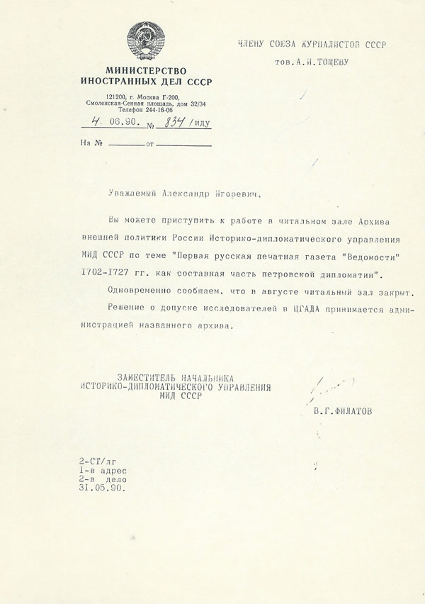 Разрешение Министерства иностранных дел члену Союза журналистов А. Тощеву на