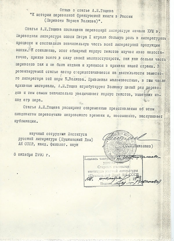 Отзыв на научную работу А.И. Тощева Института русской литературы. 1990 г.