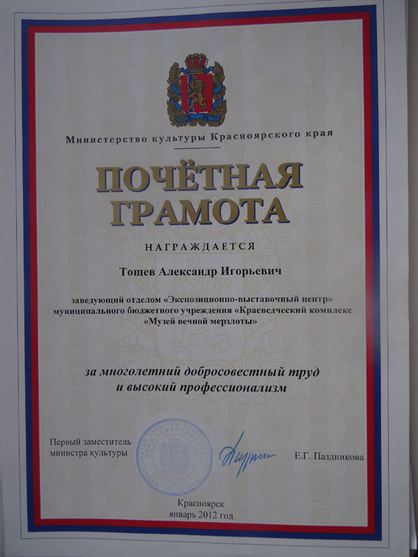 В ту памятную встречу вместо получаса мы проговорили более двух часов. Мне казалось, что я знаю их всю жизнь, так естественно, просто было наше общение. Говорили обо всем. О судьбах узников стройки 503 и о судьбе Дмитрия Владимировича, который отбывал срок в Ермаково, в тюремном театре, о судьбе музея в Игарке. Рассказывал, в основном, Александр Игоревич, причем с такой горячностью и любовью к Крайнему Северу, к Игарке, что можно было подумать, что это не «край света», а земля обетованная. Расставаться не хотелось. Мы обменялись домашними телефонами и сфотографировались с ними на память. Александр Игорьевич подарил мне три сборника о стройке № 503 и фильм о музее. Так я виртуально прошлась по всем залам музея и «побывала» в его подземельях, где ныне царит царство Вечной мерзлоты, а когда-то это «была родина гиперборейцев, ариев, славян…» ( из статьи А.И.Тощева)