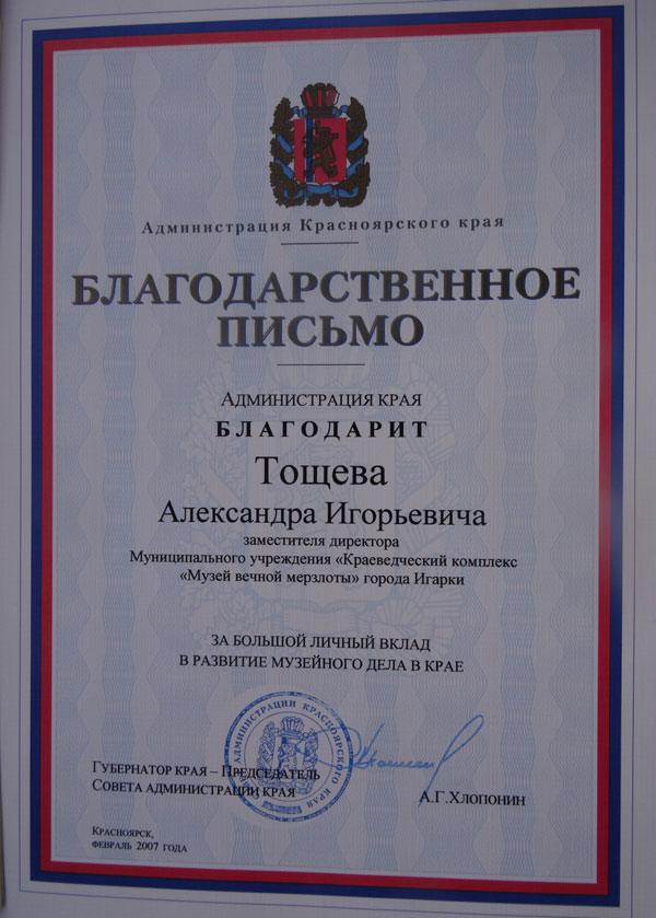А.И. Тощевым проделана огромная по своим объемам работа по восстановлению в памяти соотечественников таких исторических имён как Николая Ивановича Евгенова, Петра Филипповича Очеретько, Ивана Ильича Леонидова. Все эти имена нашли достойное отражение не только в постоянной экспозиции отдела истории Краеведческого комплекса «Музей вечной мерзлоты» г. Игарки, но и в музейных изданиях.