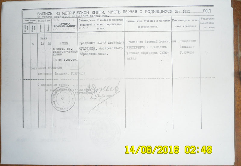 О взаимоотношениях русских помнит и сама Любовь Ивановна. Когда мы шли в гости к ней, то договорились с моим руководителем, что попытаемся узнать о культуре русской диаспоры в Китае. Калякина Надежда Васильевна была одноклассницей ее племянницы. И рассказала мне, что уровень жизни семей Нестеренко - Суховеевых был гораздо выше, чем у остальных жителей Денисовки. Нашим открытием стали предметы, вывезенные семьей из Китая и хранящиеся в семье как память о жизни в Китае (приложение 2). Надежда Васильевна утолила свое многолетнее любопытство, узнав, почему в Денисовке Екатерина Степановна Нестеренко выполняла функции священника. Всех покойников отпевала, детей крестила, была очень уважаемым человеком в деревне. Из рассказов хозяев, матери и дочери, мы узнали, что в городе Мулин была русская православная церковь, ставшая центром жизни русской диаспоры. При церкви была церковно-приходская школа, где учились дети русских мигрантов. Батюшка по фамилии Дзюгаев был из рода Джугашвили (Сталина), который тоже спасался от репрессий в Китае. В церкви проводились венчания, крещение детей. В семье хранится копия записи из метрической книги за 1952г этой церкви, о крещении племянницы Любови Ивановны (приложение 3). В записи указаны имена восприемников – крестных отца и матери. Из записи от 18 июня мы узнали, что девочку назвали в честь великомученицы Ирины. Русская община отмечала все христианские праздники, все обязательно ходили на воскресные службы. Екатерина Степановна пела в церковном хоре. Но особенно часто она стала ходить в церковь после смерти своего восемнадцати летнего сына Сергея, который умер в 1937 году от менингита. Видимо в молитвах и разговорах с батюшкой мать находила утешение. Русские и в Китае сохраняли свою культуру.