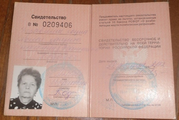 Свидетельство Подоляк Л.И – жертвы политических репрессий