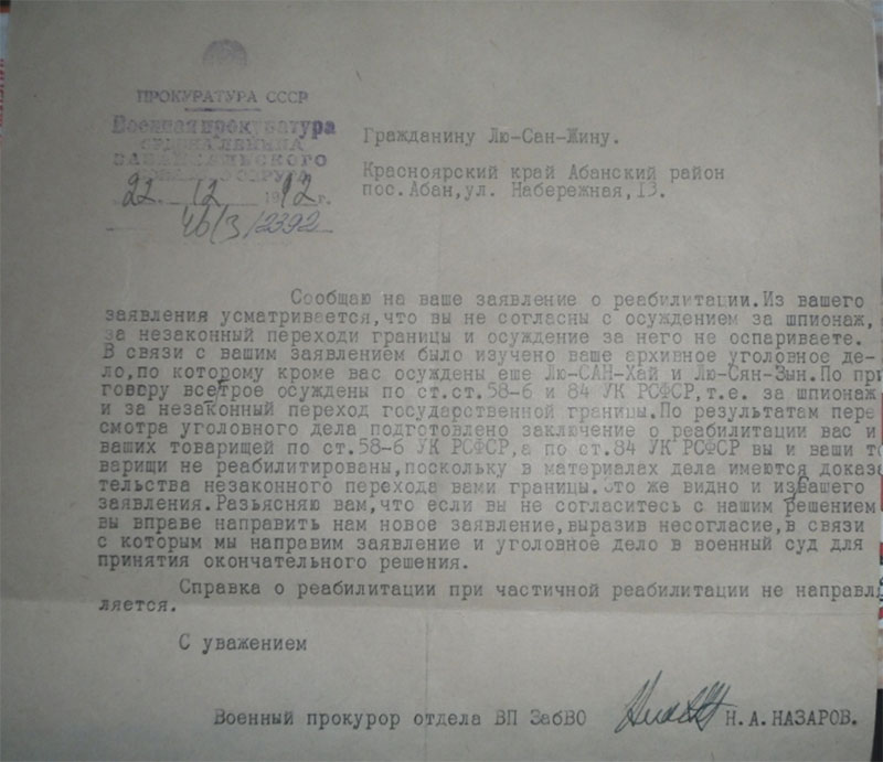 Изучая судьбу своего прадеда, мы оценили взаимоотношения сибиряков с репрессированными китайцами как дружелюбные. Старожилы Абана до сих пор помнят «гостеприимство китайца Васи». В Абане было много ссыльных и простые сибиряки оценивали их по душевным качествам, трудолюбию. Так родившись в Китае, мой прадед Лю Сян Жин корни пустил на Абанской земле. Работники ЗАГСа, не понимая его речь при регистрации детей, записали отчество Сергея – «Житович», а имя Людмилы - «Люта». Несправедливостью Беляковы всегда считали даже эти «паспортные извращения». Образованные дети добились реабилитации своего отца в 1992 решением суда Забайкальского округа.