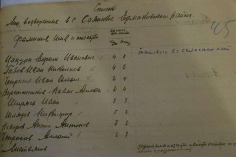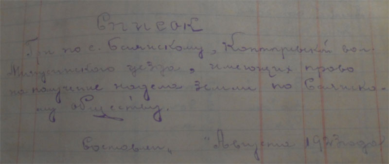 «Список сельской участковой комиссии: Кручинкин Д.М., Солдатов В.Ф., Чучалин Н., Кузьмин А., Ямщикова Агафья, Замятина Таисия, Кузьмин Осип».