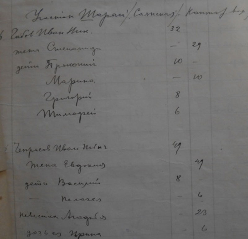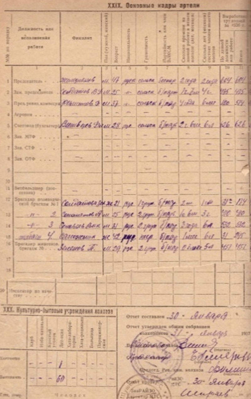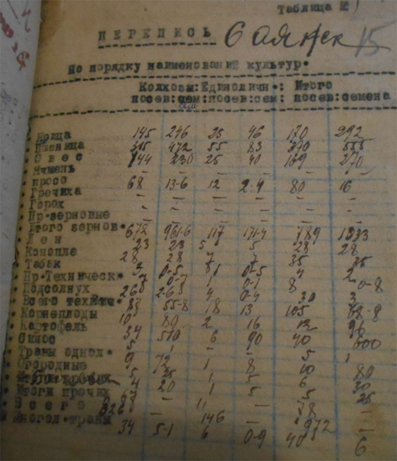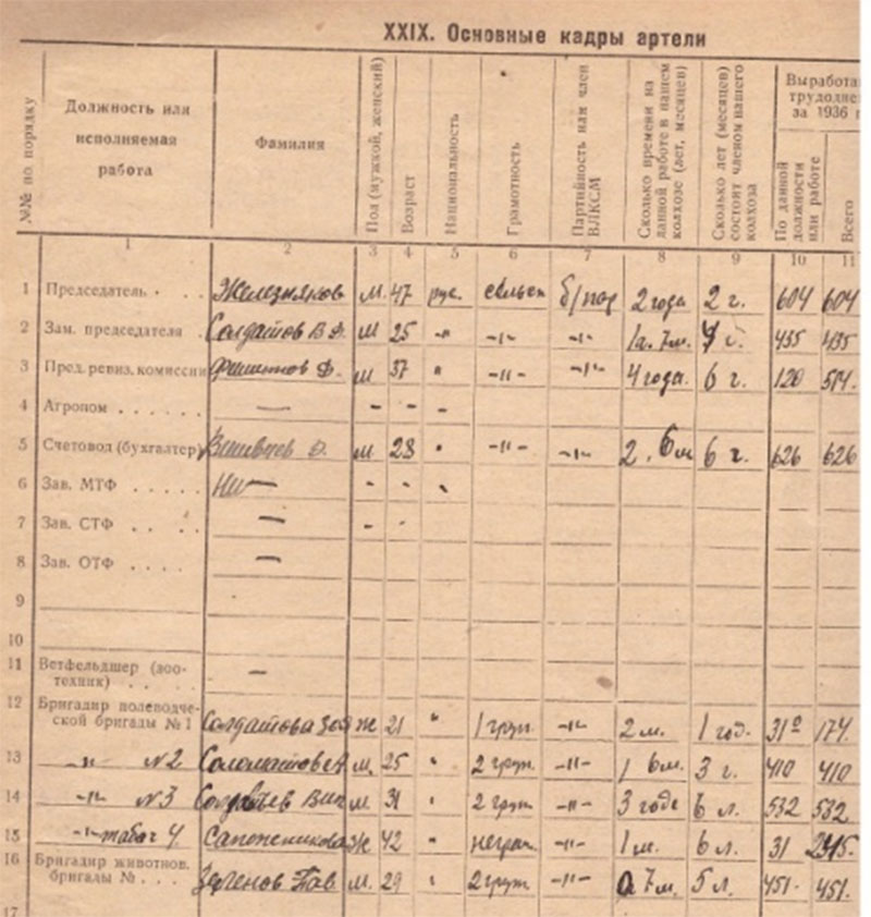 Свою эпопею колхоз начал с 41 семьи батраков, пик роста приходится на 1934 год – 146 семей в лице 467 членов, к тридцать девятому году наблюдается полный охват колхозной жизнью. Анализируя сводную таблицу по составу хозяйства, нами составленную по документам, можно выдеоить большое количество «отходников» - в 1933 году их было 69, а к 39-му всего 3. Леоненко Мария нам объяснила значение слова «отходник» - это когда один из членов семьи уходил на работы в леспромхоз, золотые прииски или строительство оросительного канала на левый берег Енисея в Хакассию на заработок «реальных» денег для семьи и выплаты налогов, а некоторые потом увозили и семьи. Мы согласились, что это сказалось на количественном составе, но самым весомым аргументом считаем, работу «сталинской молотилки» по раскулачиванию - 146-и семей с 1928 года.