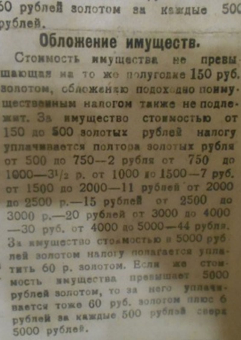 Саянские казаки приняли выполнение обязанностей перед новым правительством: платили продовольственный налог хлебом, а с 1924 года больше деньгами, излишки сельхозпродуктов могли продать по фиксированным невысоким ценам. Сохранялось право применять батрацкий труд, при собственном трудовом участии. Налог был прогрессивным, поэтому бедняки-батраки не платили ничего. В библиотеке Минусинского краеведческого музея мы работали с подшивками уездной газеты «Власть труда», что является официальным подтверждением. На страницах газеты № 99 от августа 1922 года прочитали об освобождении от уплаты единого с\х налога: малоимущих, единоличников и коллективы у которых нет скота и при 3\4 десятин земли. В газете № 3, этого же года, размещён приказ Минусинского Уездного Исполнительного Комитета о введении трудового гужевого налога от 24.04.1922 года. Облагалось трудовое население гужналогом на рабочий скот. «Шушенская волость: Муж.- 1277 человек, жен. – 667 = 1944 чел. Рабочего скота - 2895 голов в расчете на 11664 трудодня, а гуж. дней - 17370. За уклонение от гуж. налога – штраф. Председатель Уезд исполкома – Алексеев. Зав. уездного отдела труда – Пржездецкий. Секретарь – Михайлов». Обнаружили, что ещё был налог «с перевозного промысла 100 рублей» [1]