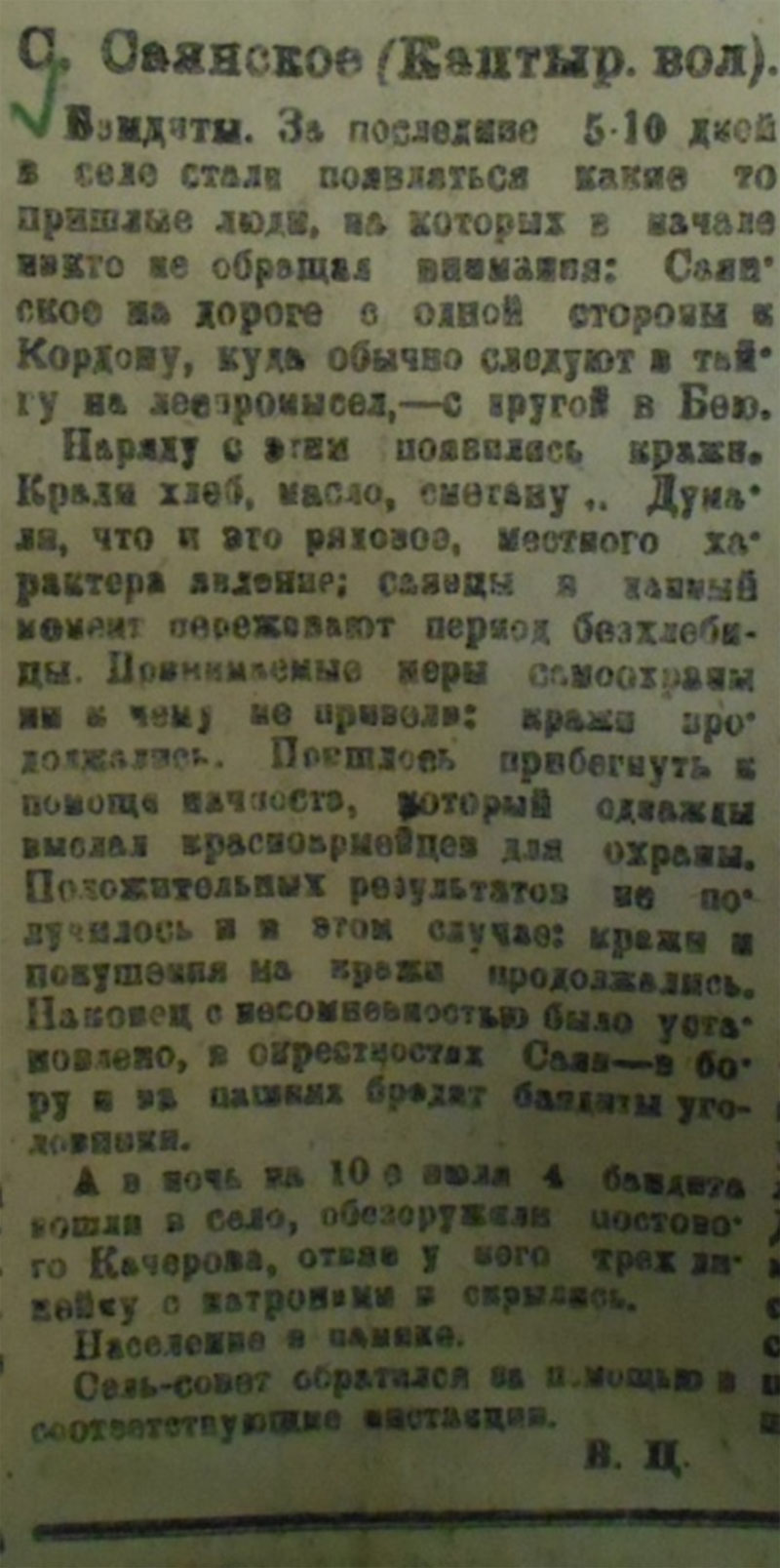 Со временем противоречия нарастали до социального конфликта, разделения населения и появления понятия «кулак» к 1927 году. Перелистывая страницы газеты, мы увидели призывы об укреплении бедняцких и середняцких союзов и ячеек; отмечается ощутимая «Активность нэпманов и кулаков, чтобы протащить своих в кооперацию и Совета» [6] Заметка М. Полевой в газете № 74 повествует о том, что жители Саянска напуганы налётом банды Кочурова на семью середняка Спиридонова. Появились бандиты и на 2-й день, но были пойманы, а часть скрылись в бору. [приложение 7]