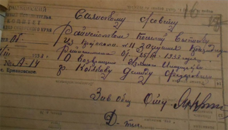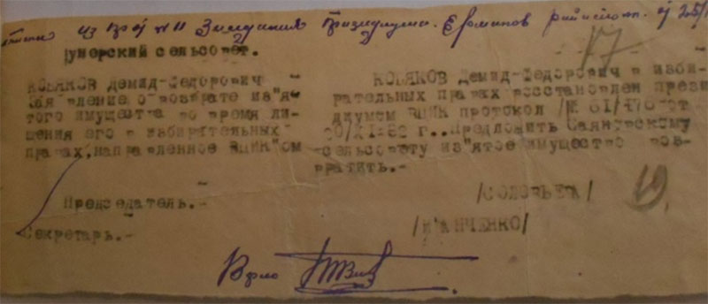 Статья И.В. Сталина в газете «Правда» (07.11.29) вещала о наступлении Года великого перелома, где предусмотрен переход от индивидуального хозяйства к коллективному. Произошло закрепление данной мысли в Постановлении ЦК ВКП(б) от 15 января 1930 года. В Красноярском округе к марту образовалось 366 колхозов. [7] В декабре начался переход к политике ликвидации кулачества как класса. Результат исполнения моно оценить умопомрачительным: по стране выслано 265795 семей. После статьи И.В. Сталина, шло восстановление в правах и возвращение имущества, ошибочно раскулаченных 950 середняков в Минусинском округе. В архиве мы обнаружили документ в подтверждение данного факта и по Саянску семьи Кобякова Демида. [приложение 8]