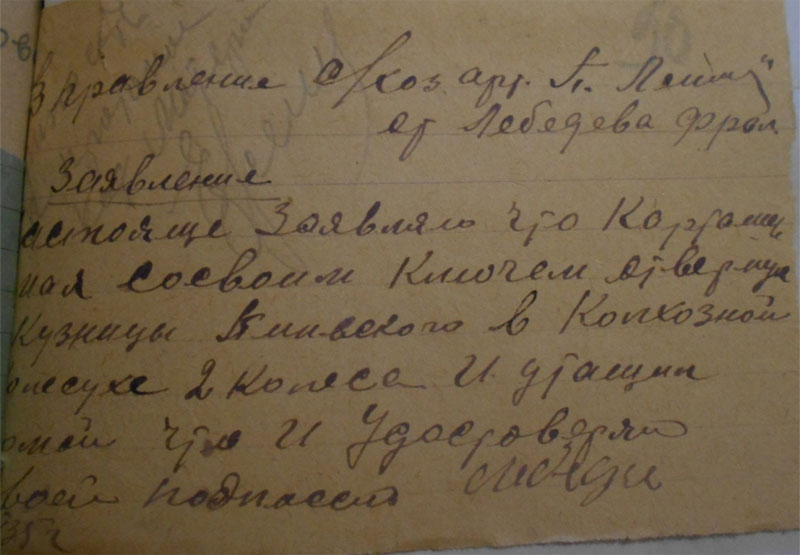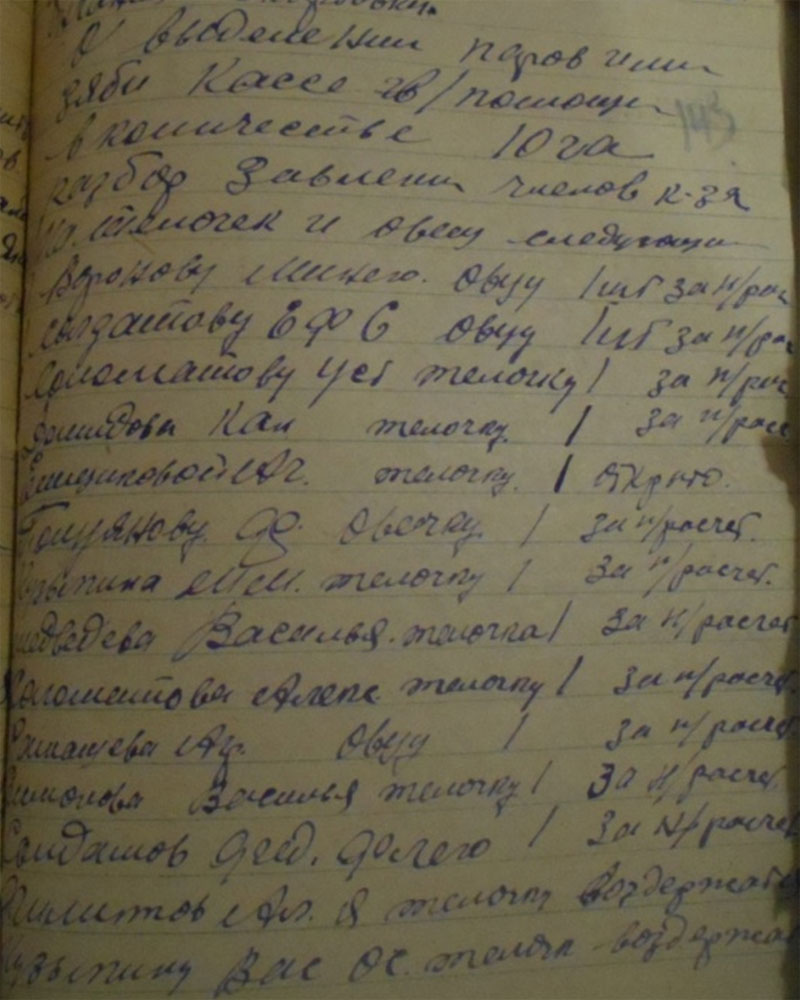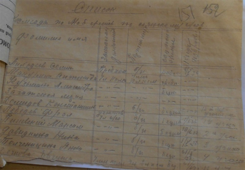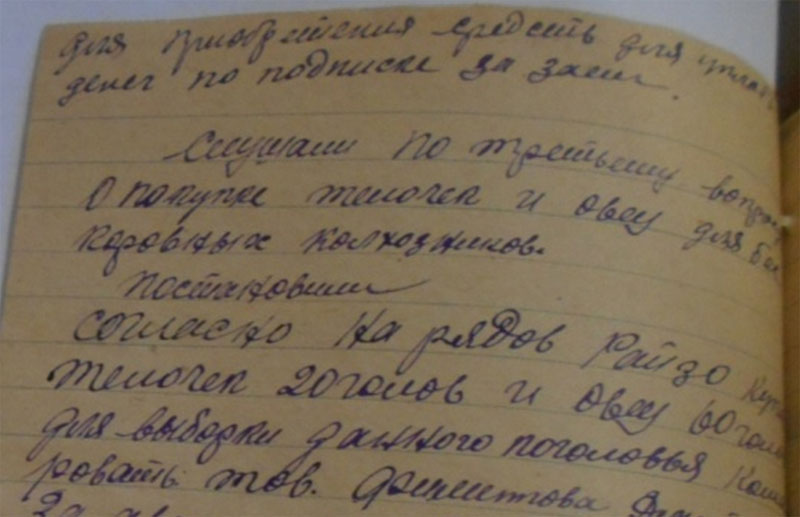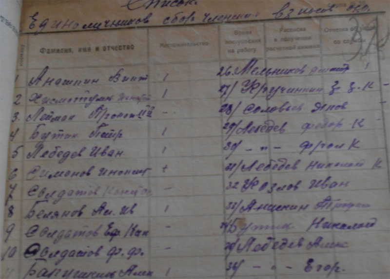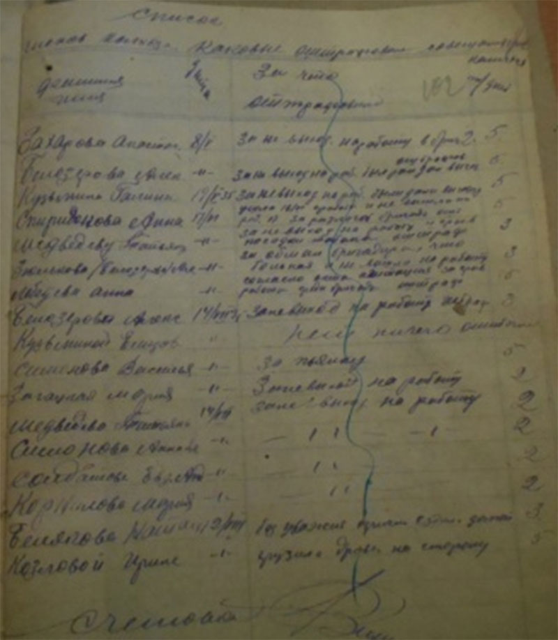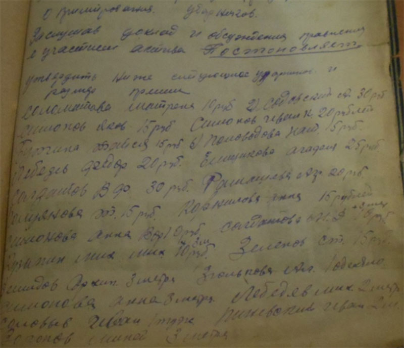26.12 1934 года «был факт разложения трудовой дисциплины по отгрузке хлеба, табака. Срыв готовили: Солдатов Константин Петрович, Булатов Петр, Кузьмин Силифон, Толченицин Петр – не хотят ехать и на лесозаготовку. Постоянно не выходят на работу – поэтому отдать всех под суд и лишить зарплаты. С Солдатовой Агнеи Михайловны за невыход на работу - снять 5 трудодней. За уход без уведомления правление колхоза с лесазаготовки на празднование Рождества в другую деревню на три дня оштрафовать – на пять трудодней: Солдатова Николая Ивановича лишить звания ударника. Солдатова Петра Прокопьевича, Солдатова Ивана Ивановича, Солдатова А. Н.»