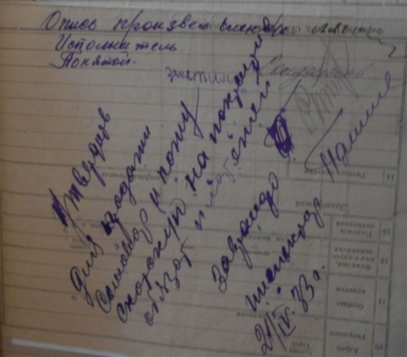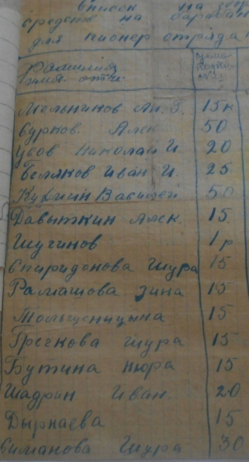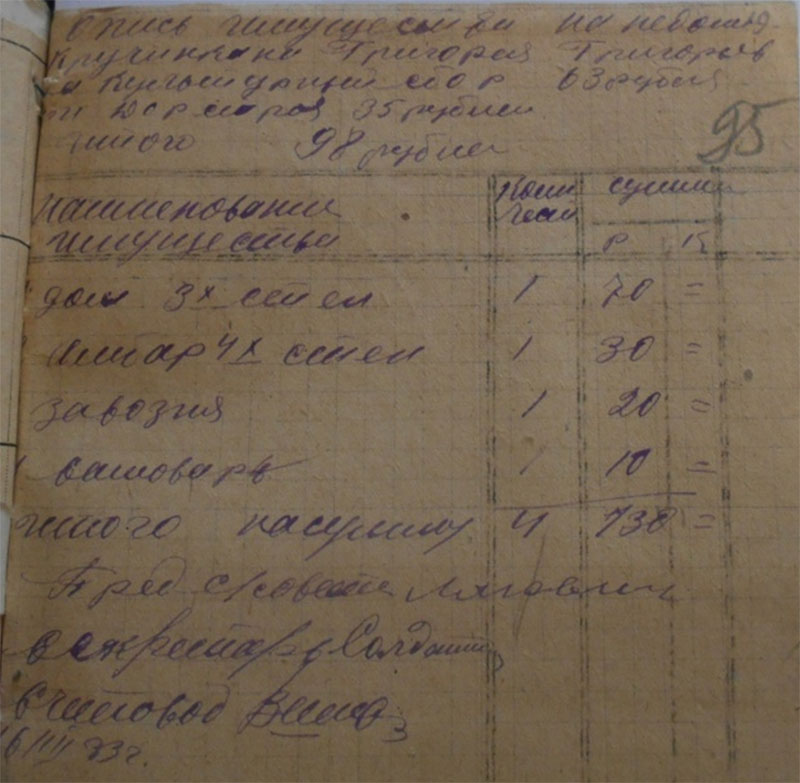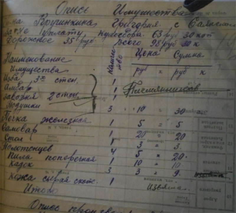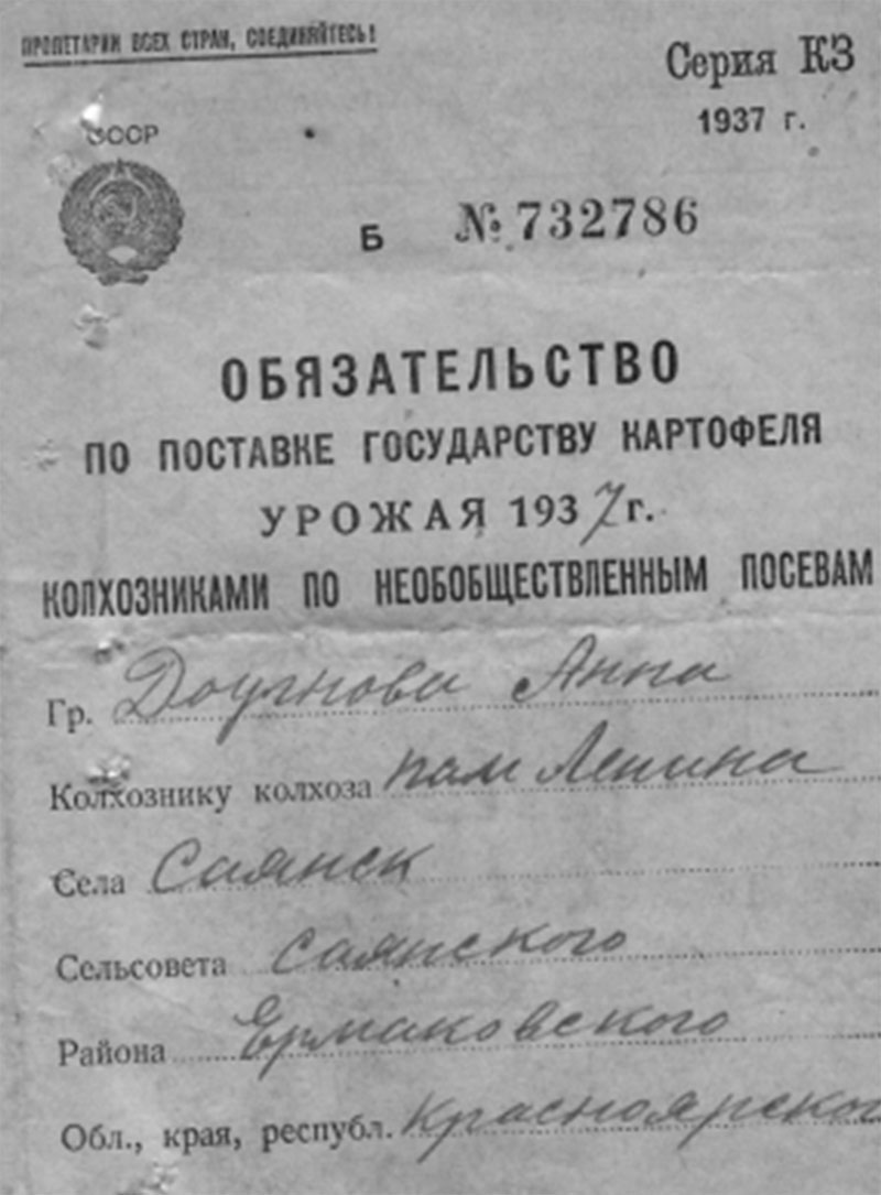 26.12 1934 года «был факт разложения трудовой дисциплины по отгрузке хлеба, табака. Срыв готовили: Солдатов Константин Петрович, Булатов Петр, Кузьмин Силифон, Толченицин Петр – не хотят ехать и на лесозаготовку. Постоянно не выходят на работу – поэтому отдать всех под суд и лишить зарплаты. С Солдатовой Агнеи Михайловны за невыход на работу - снять 5 трудодней. За уход без уведомления правление колхоза с лесазаготовки на празднование Рождества в другую деревню на три дня оштрафовать – на пять трудодней: Солдатова Николая Ивановича лишить звания ударника. Солдатова Петра Прокопьевича, Солдатова Ивана Ивановича, Солдатова А. Н.»
