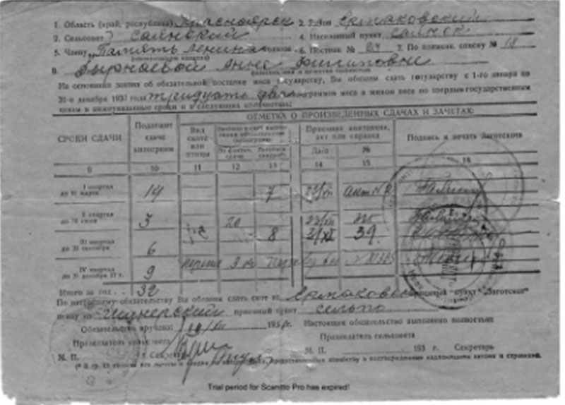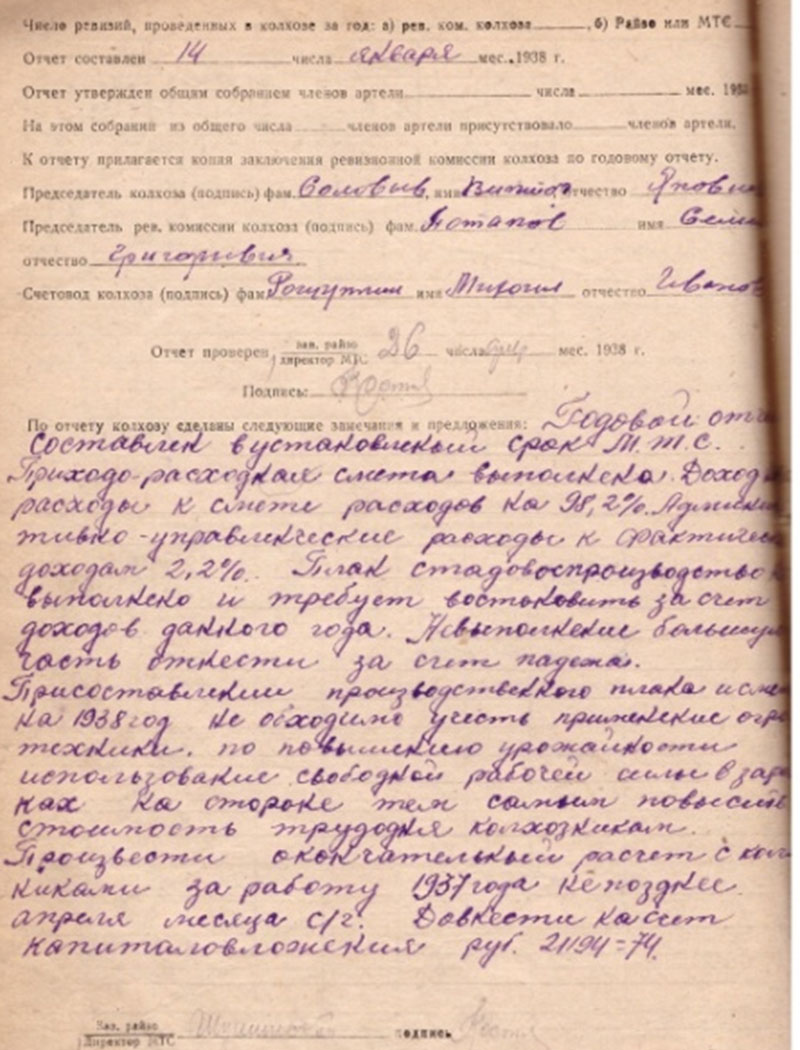 По трудодням выдать 862 центнеров на 40703 т\дня - по 2 кг на один т\день. Денежные доходы в сумме 34853-95 и расходную часть в сумме 20594-88 рублей - утвердить. На 41372 трудодней утвердить в сумме 14259 руб. Произвести начисление ударникам труда от 10-20%. 17 января 1934 года». [11] Урожайность 1936 года составляла положительный баланс. [приложение 11] В доходной части отчёта колхоза 1937 года обнаружили статью 19 – заработок на стороне в сумме 8 956, видимо, колхозников направляли на выполнение не прямых колхозных работ. [приложение 12]