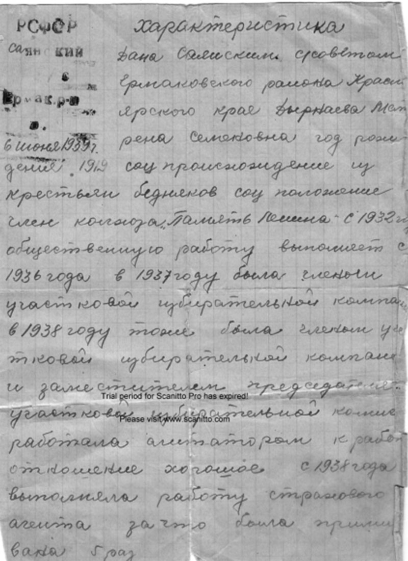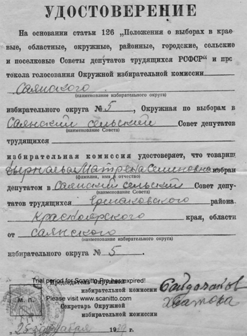 Из семейного архива Дырнаевой Матрёны Семёновны, с. Саянск, работали Кузьмина А., Лазарева В., материалы взяты в июне 2014 года.