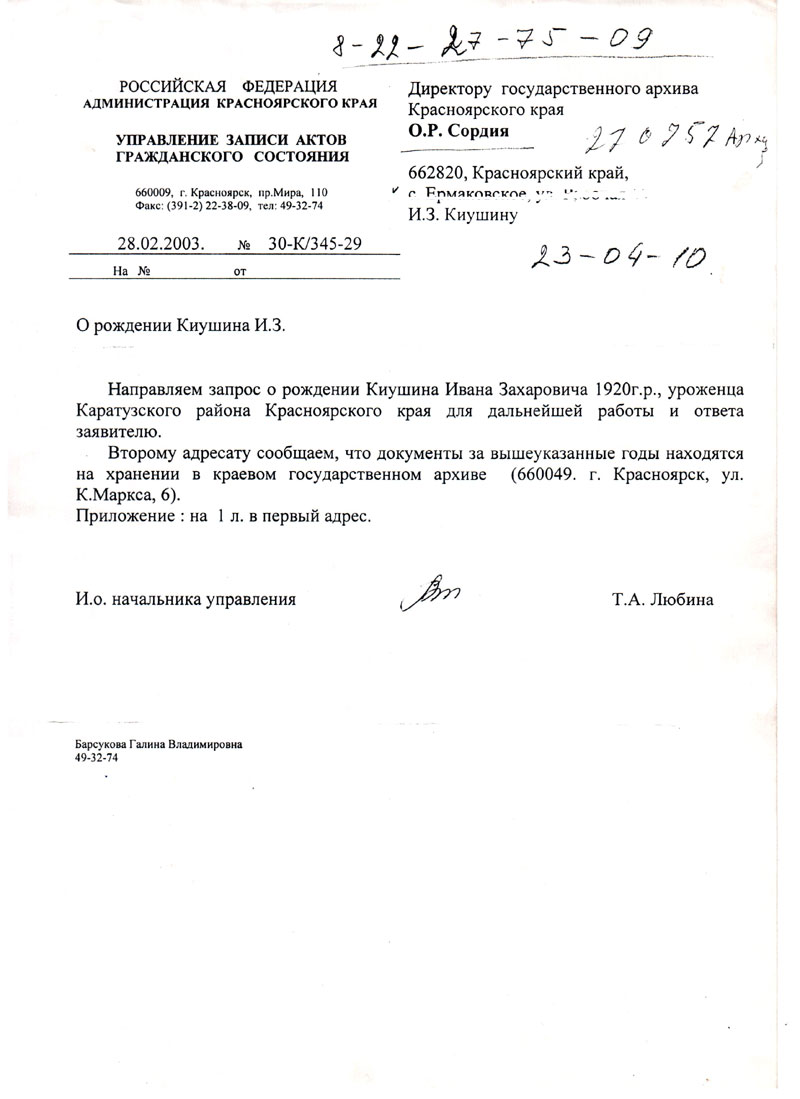 Востоке: «Клушин Иван Захарович, род. 1920, д. Лебедевка Каратузского р-на.