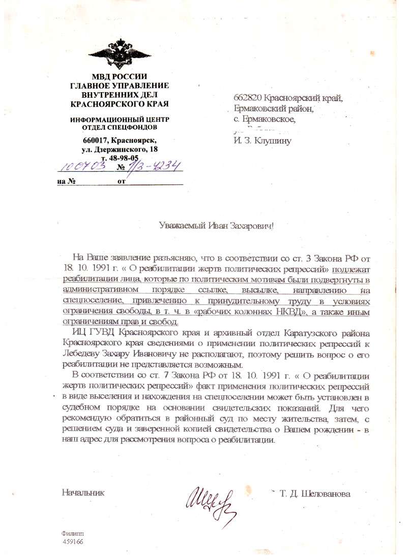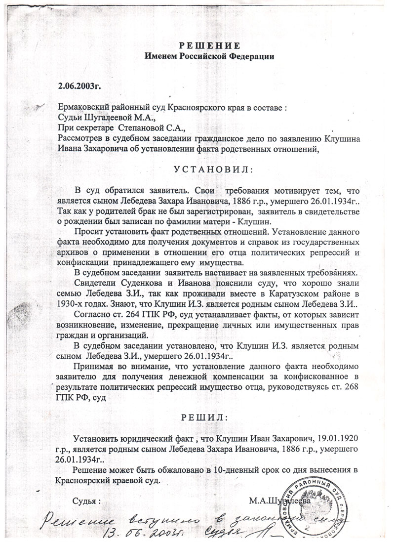 В ходе судебного разбирательства было признано родство Лебедева Захара Ивановича и Клушина Ивана Захаровича. Но подтверждение родственных связей было только началом. Последующие судебные разбирательства привели к тому, что Ивану Захаровичу было отказано в признании Захара Ивановича политически репрессированным: «На Ваше заявление разъясняю, что в соответствии со ст. 3 Закона РФ от 18. 10. 1991 г. «О реабилитации жертв политических репрессий» подлежат реабилитации лица, которые по политическим мотивам были подвергнуты в административном порядке ссылке, высылке, направлению на спецпоселение, привлечению к принудительному труду в условиях ограничения свободы, в т. ч. в «рабочих колоннах НКВД», а также иным ограничениям прав и свобод ».