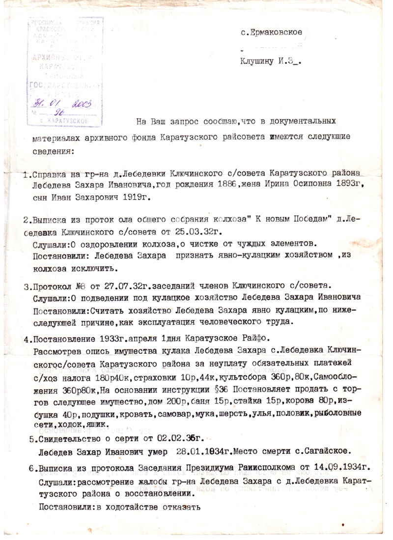 Иван Захарович, мой прадед, родился в незарегистрированном браке, 19 января 1920 года в селе Сагайск Каратузского района. В 2003 году мой прадедушка подавал заявление на признание своего отца политически репрессированным, но для этого ему сначала нужно было доказать, что он является сыном Захара Ивановича. Это было проблематично, так как фамилии у них были разными (у Захара Ивановича — Лебедев, а у Ивана Захаровича — Клушин). И моему дедушке надо было доказать, что они родственники.
