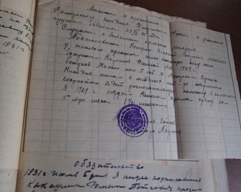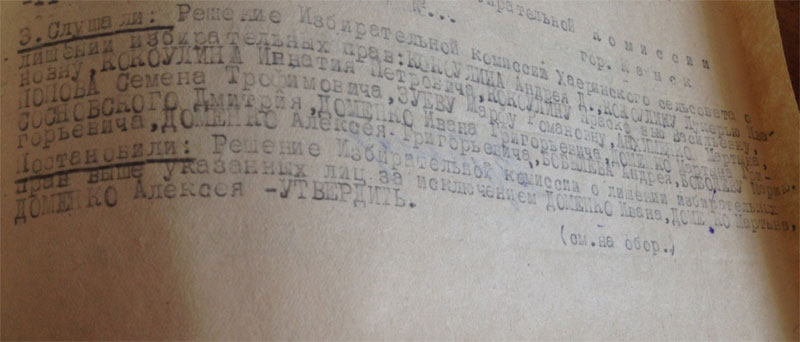 Семьи Антоновых, Какоулиных, Романенко, Митрофановых, Какулиных, Смирновых, Кокоулиных, Рымаренко, Захаренко, Сколонец, Симаненко, Сосновских, Поповых, Зуевых, Архименко, Доменко, Бобылевых в основном раскулачивались, члены семьи лишались избирательных прав. Разрушены семьи, мужья вынуждены скрываться или попали в ГУЛАГ. А дети? Их не принимали ни в пионерскую, ни в комсомольскую организации. Детская психика подрывалась тем, что ребенок в коллективе становился изгоем. Свою роль играла зависть. Когда просматриваешь документы, то диву даешься, как человек с начальным образованием мог писать так грамотно и красиво. Многие документы написаны одним почерком.