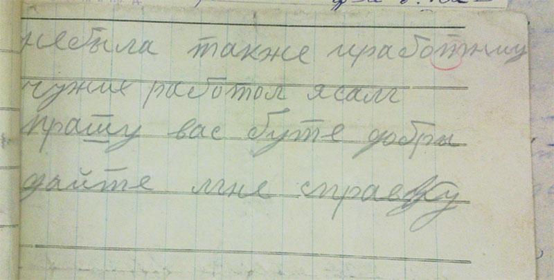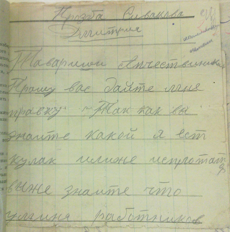 «Заевление в Абанскую милицию от канарайских бедняков. Мы заявляем вам что Б. М. кулачка спрятана сеялка влесу и нидает никому сеят паэтому просим вас ее взят чтобы ее работать. Еще заевляем что ее муж шлет письма чтобы она ехала кнему то она падмазалас ксел-совету сел-совет выдал дукумент батрачиский она хочит уехать еще заявляю вам чтобы вы абанский их и найдете ее мужа писма еще заевляем что М. (нрзб) 3 мишка пшаницы (нрзб) и распродала хлеб на сторону»