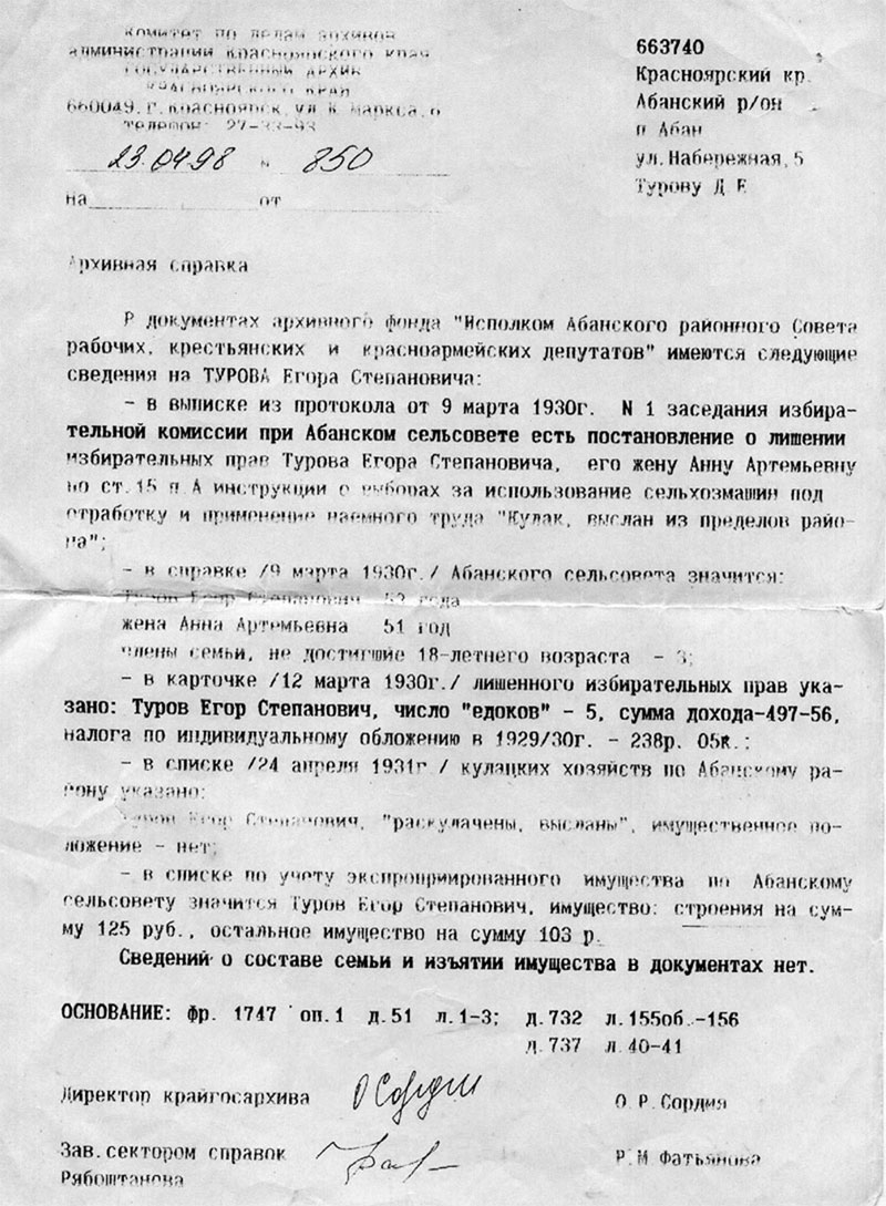 КУБАСОВ Николай Николаевич. Проживал в д. Турово Туровского с/с Абанского р-на Канского округа. В 1929 лишен избирательных прав как священник туровской церкви. Осужден 18.02.1930 особой тройкой ПП ОГПУ СК на 10 лет ИТЛ с высылкой семьи в Нарымский край. ЛОЙКО Елисей Кузьмич. Проживал в д. Сенная Петропавловского с/с Абанского р-на Канского округа. В1927 лишен избирательных прав как служитель религиозного культа, семья выслана за пределы р-на. И таких примеров очень много.