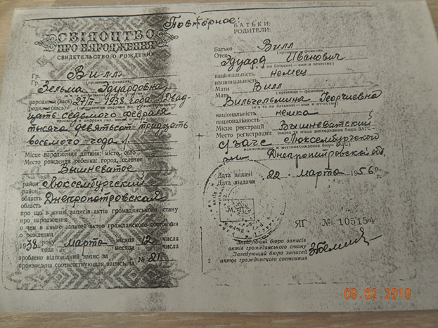 Свидетельство о рождении Зельмы Вилл (семейный архив)