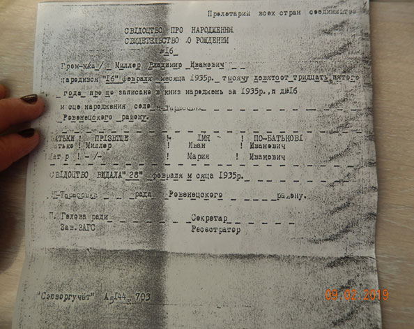 Свидетельство о рождении Владимира Миллер (семейный архив)