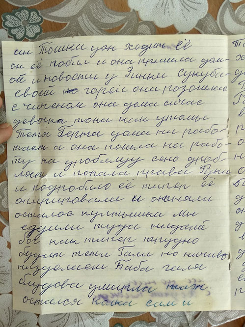 Эта жизнь в казахской Некрасовке не была легкой, и даже тогда, когда окончилась война и переселенные немцы, казалось, могли вздохнуть свободно. Об этом говорит, сохранившееся письмо, которое прабабушка писала своей дочери и моей бабушке в Сибирь. Вот маленький отрывок. Из него мы узнаем о родственнице, которая получила травму во время работы. Травма оказалась настолько тяжелой, что женщине отняли руку. Что ж эта была за работа, на которой могла покалечится взрослая женщина?!