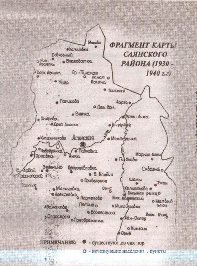 Таким образом, можно сделать вывод о том, что поселение Марьин Клин существовало задолго до открытия там лагерного пункта Тугачинского отделения КРАСЛАГ, а в народных легендах события тех давних лет перемешались. Возможно, и погибла когда-нибудь девушка по имени Мария в тех местах, возможно, остался клин от ее юбки после звериного пиршества. Но слово «клин» имеет в русском языке много других значений. Согласно толковому словарю Ожегова, клин – это часть земельного угодия, выделяемая по какому-нибудь признаку (например, по местности). Какое из значений послужило названию поселения? Если посмотреть на карту Саянского района 30 – 40гг прошлого столетия (рис.1), то можно утверждать, что поселения Тугач, Шамы и Марьин Клин географически расположены так, что при соединении их линиями по карте образуется треугольник, с вершиной в Марьином Клину. Не отсюда ли пошло название Марьин Клин?! (Это мои предположения, но проверить их невозможно.) Итак, легенда о происхождении названия Марьин Клин несколько не сходится с фактами, но на то она и легенда.