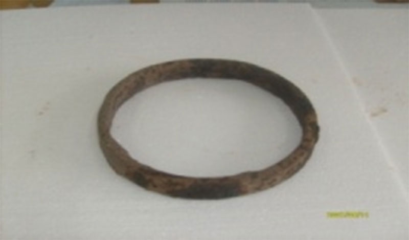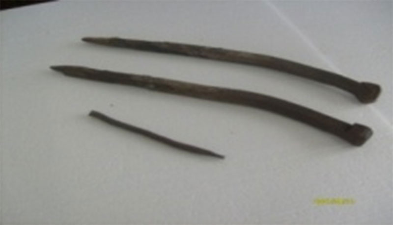 И вот мы вышли к «перекрестку». С этого места начиналась дорога через деревню. По обе стороны дороги видны били остатки от бывших домов жителей Марьиного Клина, ямы подполий. Здесь можно было найти старые ведра, бочки, кровати. Покопавшись в земле, без труда мы находили предметы быта и хозяйственной деятельности: разбитые глиняные крынки, гвозди, обручи. Все было изготовлено вручную: гвозди и штыри кованные (рис.6) (известно, что при лагерном пункте была кузня).