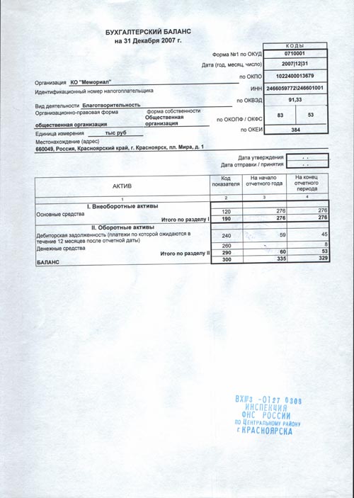 Финансовый отчет правления Красноярского общества «Мемориал» за 2007 г.