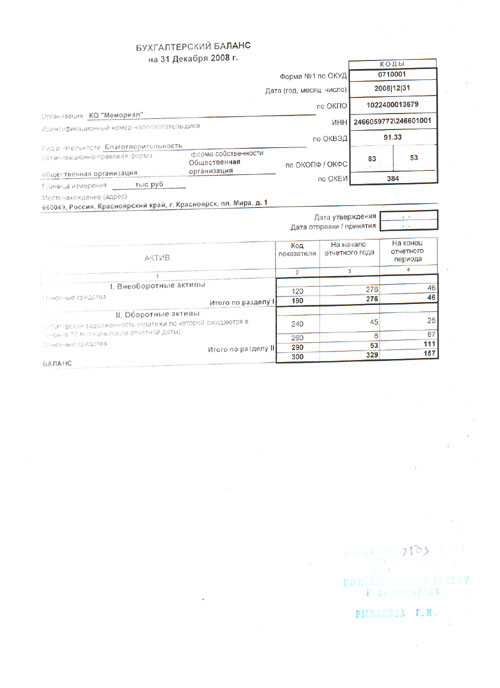 Финансовый отчет правления Красноярского общества «Мемориал» за 2008 г.