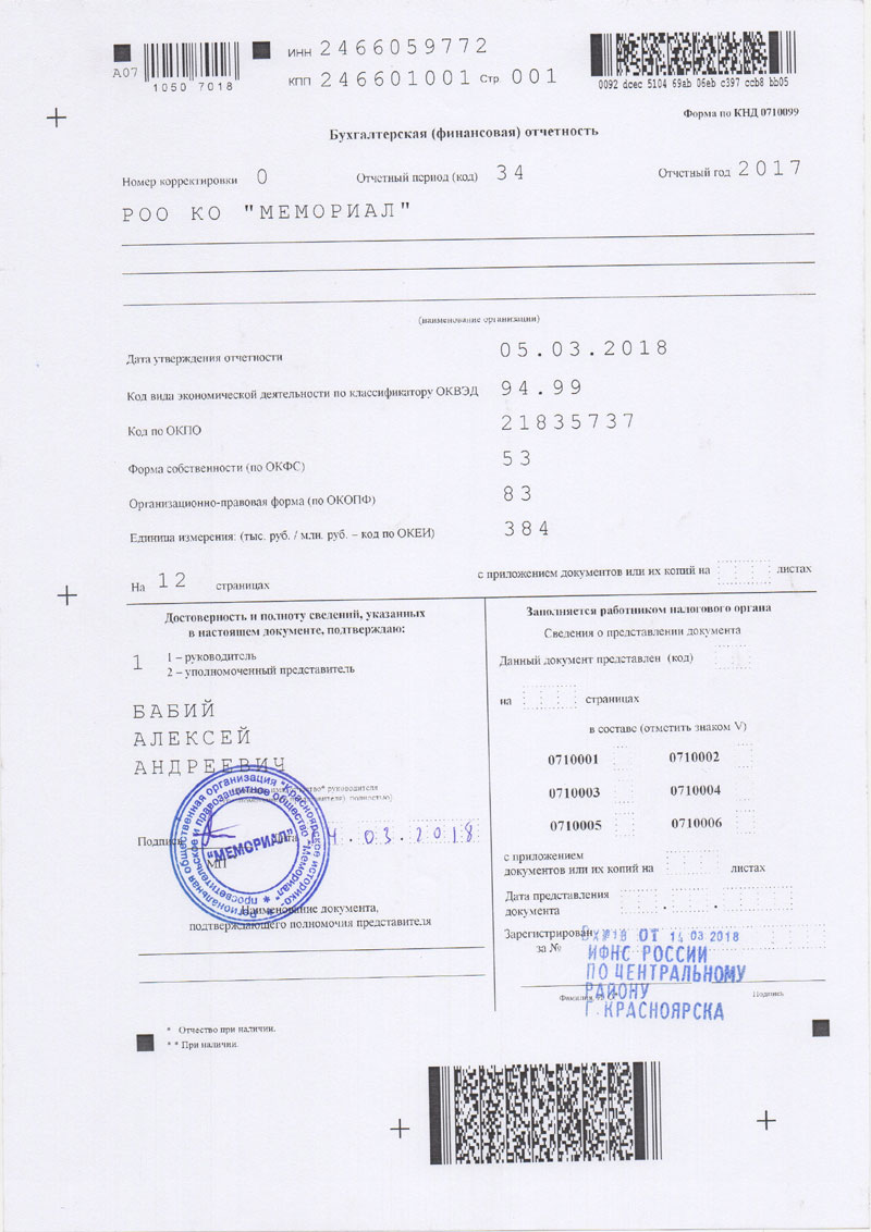 Финансовый отчет правления Красноярского общества «Мемориал» за 2017 г.