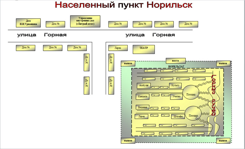 Daraus ergibt sich folgerichtig: Bergstraße (Haus von N.N. Urwanzew – „ein Dutzend Häuser“ – „Hinterlistiges Haus) – Theater – Norillag (s. Anhang 2. „Ortschaft Norilsk 1939“).