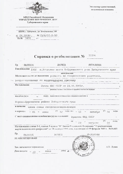 Die Familien von Larisa Jakowlewna Pylenok, Iwan Abramowitsch Tews und Maja Georgiewna Lunjowa lebten viele Jahre in großer Angst: „... sie werden kommen und uns holen, und sie werden keine Erklärung abgeben ... Warum? Mit welchem Recht?“ Und all das nur, weil sie politisch Verfolgte und zur Umsiedlung Verdammte waren.