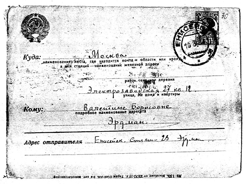 Aus den Erinnerungen der A.I. Stepanowa: „Man hat den Verhafteten N.R. Erdmann in einem Gefangenen-Waggon nach Sibirien gebracht und ihn erst in Krasnojarsk wieder in die „Freiheit“ entlassen, von wo aus er selber, auf seine Kosten, nach Jenisejsk gelangen sollte – den Ort seiner Verbannung“.