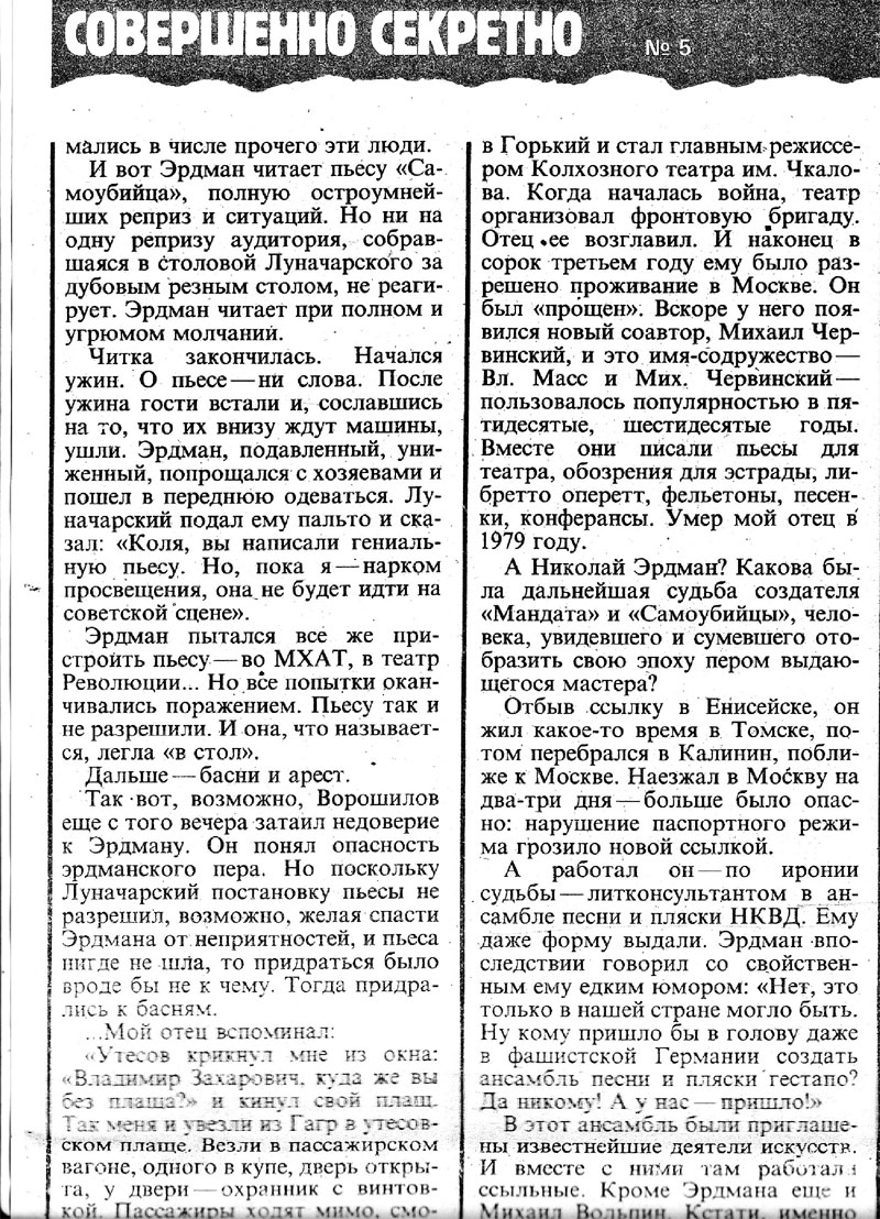 Aus den Aufzeichnungen eines Literatur-Wissenschaftlers: „Nikolai Erdmann – ein rätselhafter Mensch. Autor eines der amüsantesten und unglaublich mitreißenden Stücke „Selbstmord“, wofür er zu leiden hatte – er wurde verhaftet und nach Sibirien verbannt.