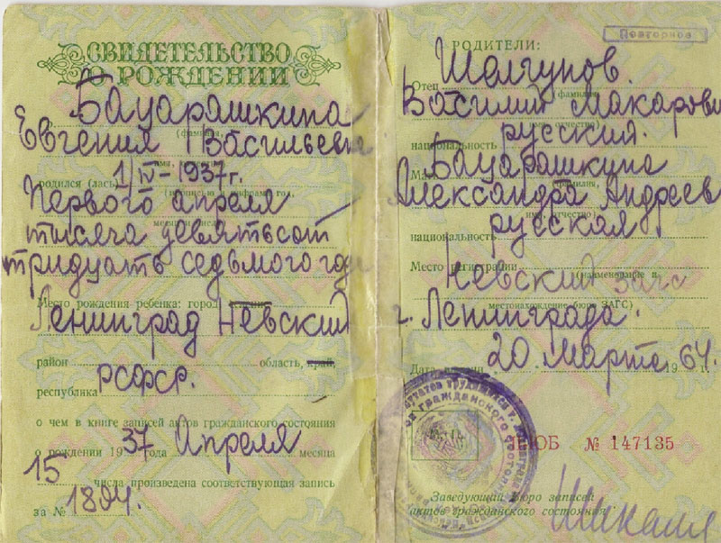 Jewegenia Wasiljewna Bazaraschkina wurde am 1. April 1937 in Leningrad geboren (Anhang 7).