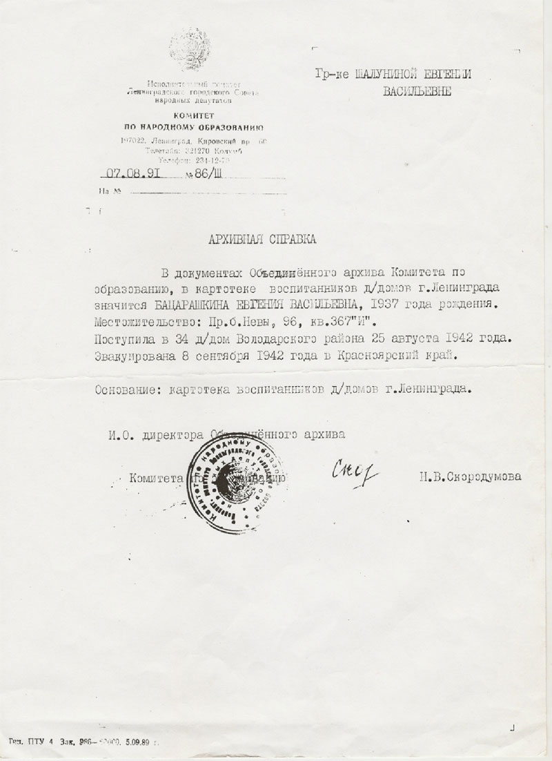 Sie wohnte mit ihrer Familie am rechten Ufer der Newa, im Haus N° 96, Wohnung 367 „i“, auf dem Gelände des Thälmann-Kombinats (Anhang 8). Jewgenia Wasiljewna kann sich an ihren Vater überhaupt nicht erinnern, aber sie weiß, dass er ein „schwieriger Mensch“ war. Er ging stets im Jackett und mit Krawatte umher und war häufig auf Geschäftsreisen.